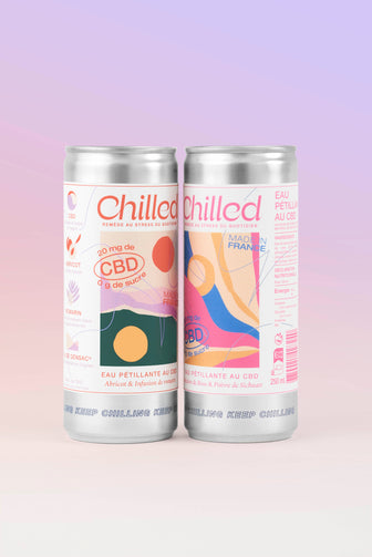 2 recettes sur une base d'eau de source française légèrement pétillante, parfumées avec des infusions de plantes et des arômes naturels, avec 0 sucre, 0 édulcorant et 20 mg de CBD par canette.
